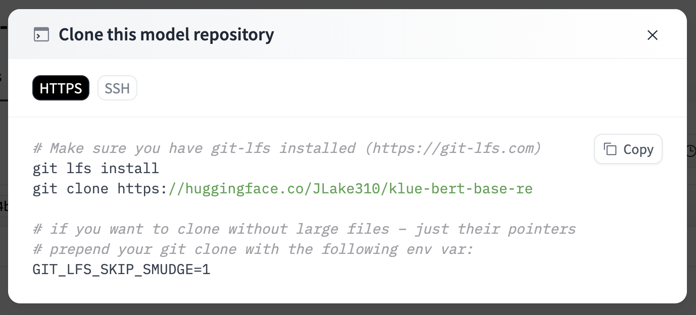 git lfs install 은 한 번만 실행하면 되기 때문에 git clone 부분만 복사해서 터미널에서 실행하면 저장소를 clone 해올 수 있다.