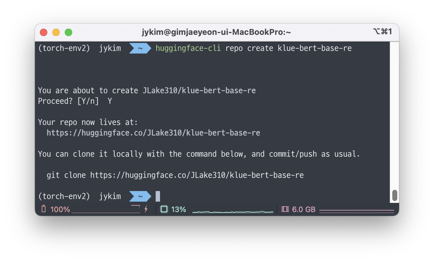 huggingface-cli repo create {프로젝트명}