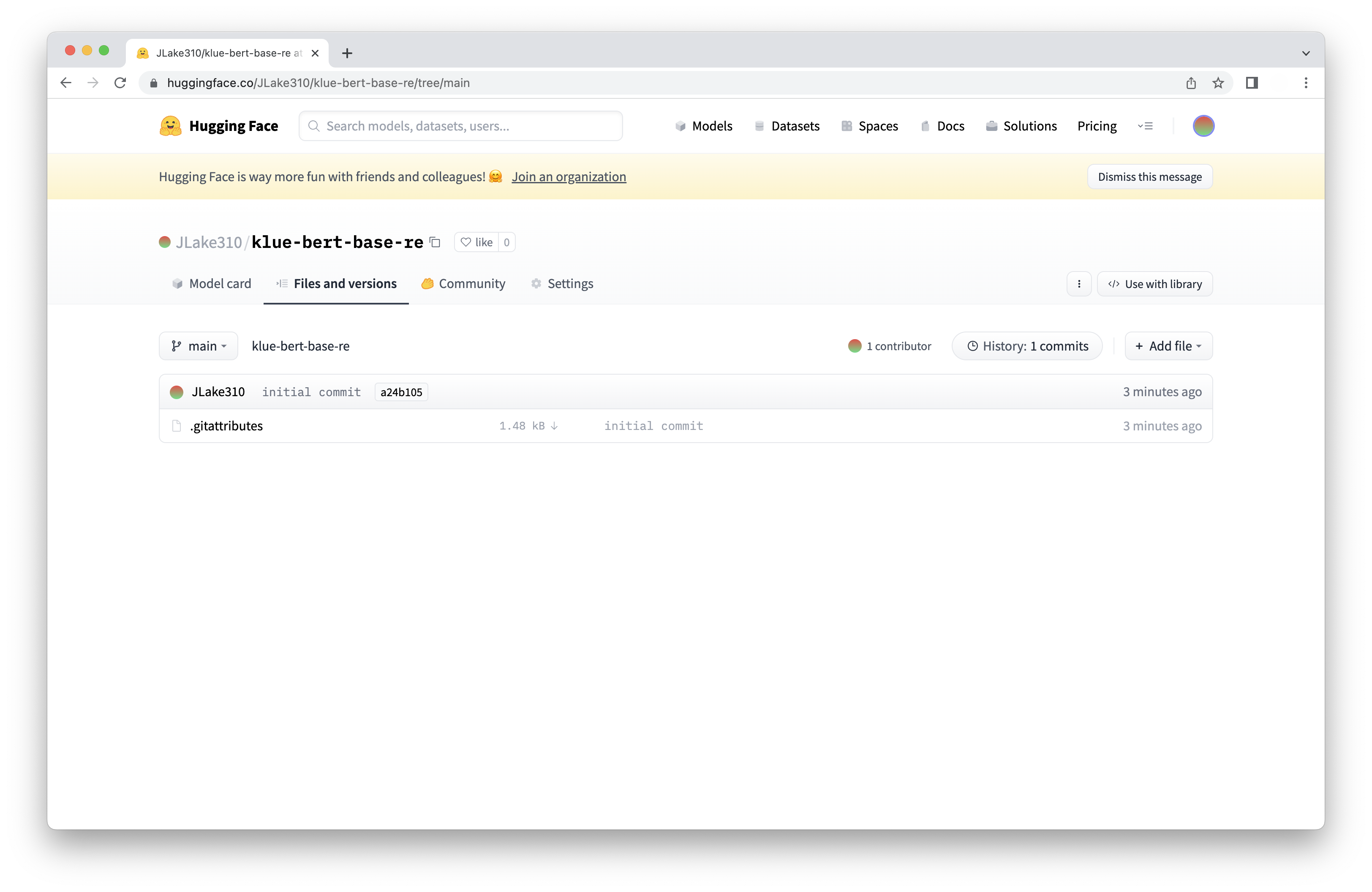허깅페이스에 들어가보면 저장소가 생성이 된 걸 볼 수 있는데,