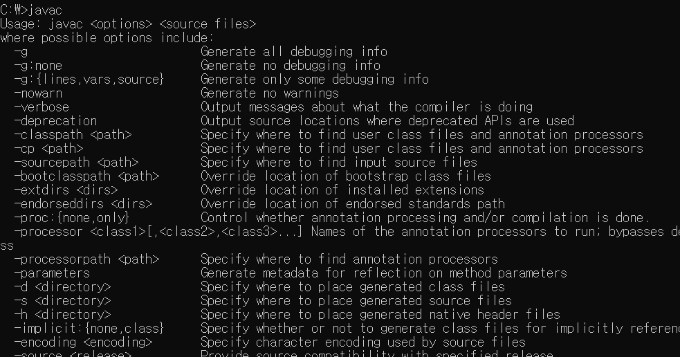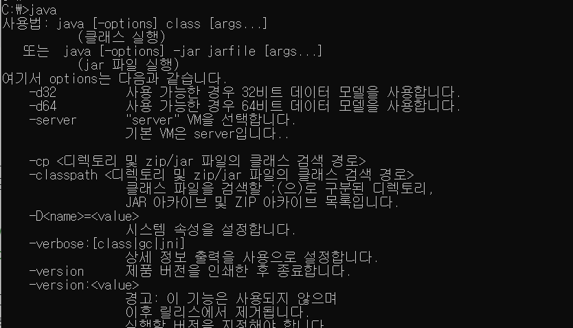 그렇게 자바를 다시 설치하고 cmd창에 java가 잘 설치됐는지 java, java -version, javac 명령어를 입력했다.