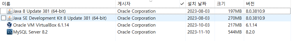제어판의 프로그램 제거에 들어가서 게시자 필터를 'Oracle Corporation'으로 체크한다.