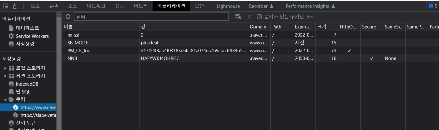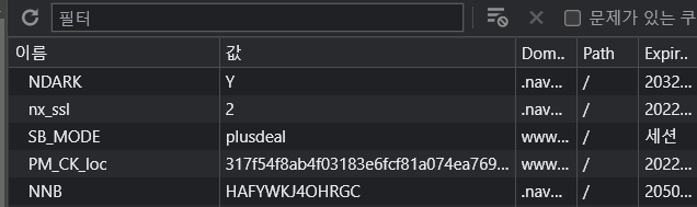 크롬에서 네이버 페이지를 열어 확인하면 쿠키가 이렇게 나온다.