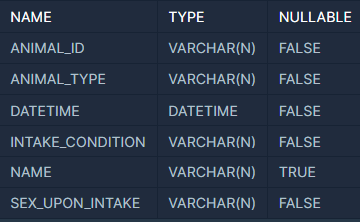 ANIMAL_INS 테이블은 동물 보호소에 들어온 동물의 정보를 담은 테이블입니다. ANIMAL_INS 테이블 구조는 다음과 같으며, ANIMAL_ID, ANIMAL_TYPE, DATETIME, INTAKE_CONDITION, NAME, SEX_UPON_INTAKE는 각각 동물의 아이디, 생물 종, 보호 시작일, 보호 시작 시 상태, 이름, 성별 및 중성화 여부를 나타냅니다.