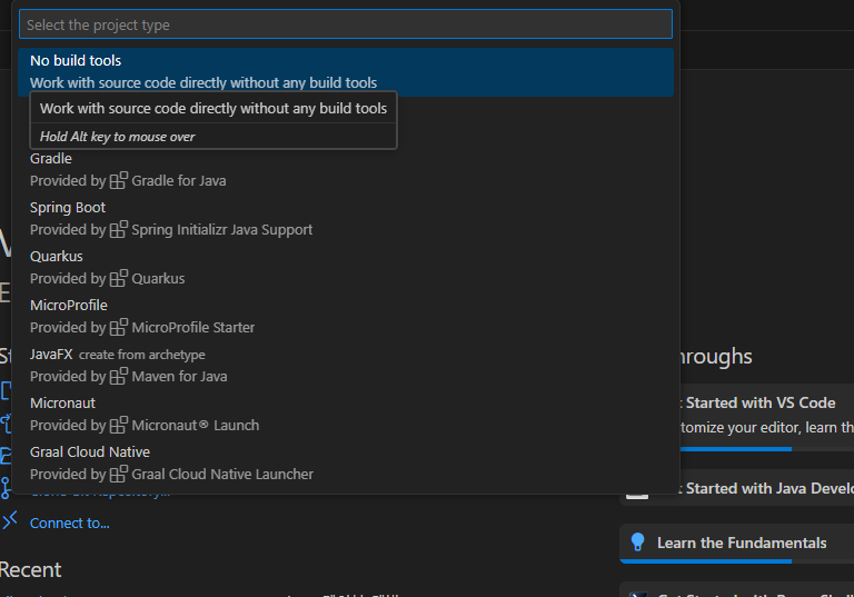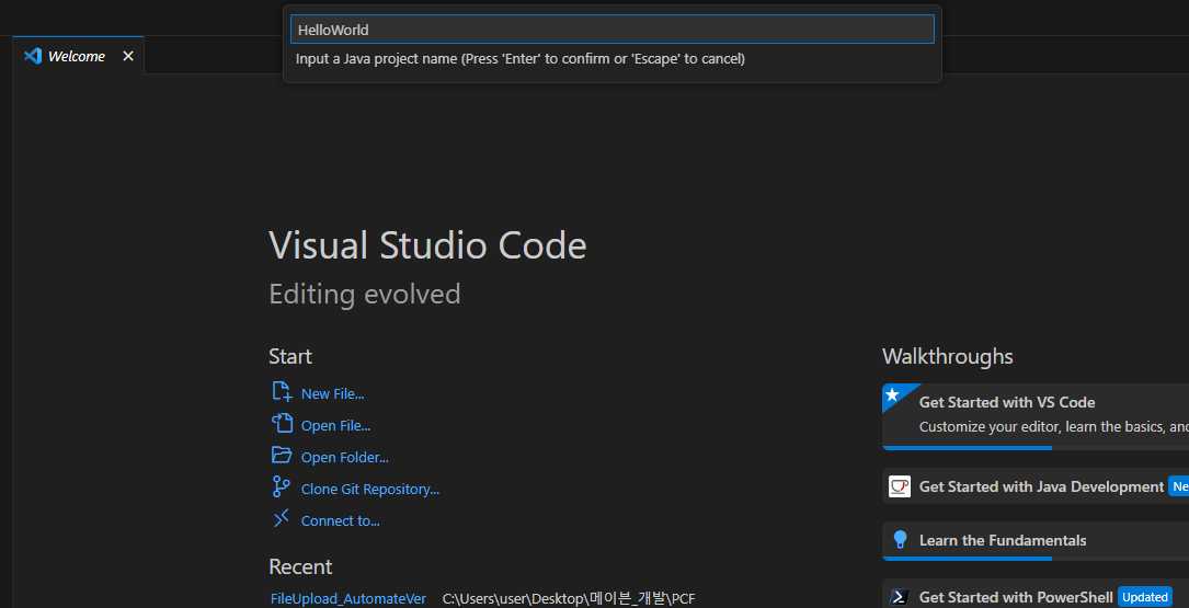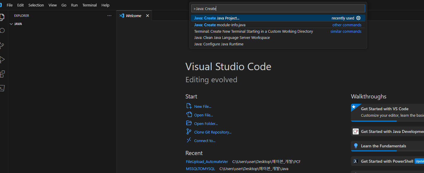 "Ctrl + Shift + P" 단축키를 누른 후 "Java: Create Java Project..." 을 입력하고 Enter를 치도록 하자.
