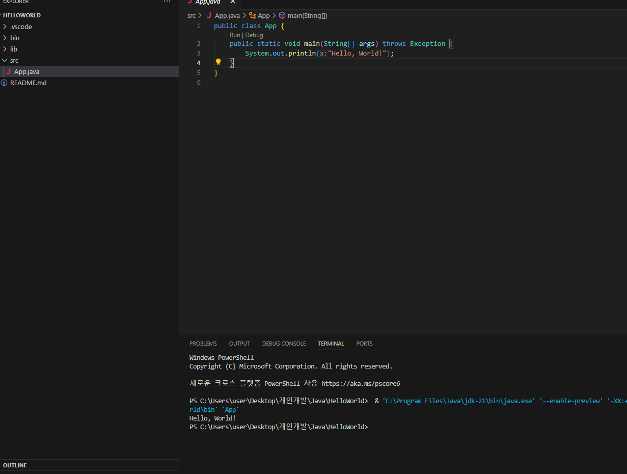 "Ctrl + F5" 키를 누르게 되면 다음과 같이 Hello World! 가 출력이 될 것이다. (반가워 자바)