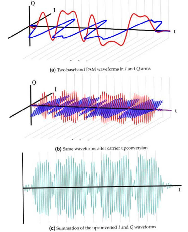 시간 축에서 cos과 sin은 직교하기 때문에 baseband 신호를 cos과 sin으로 동시에 곱해 passband 신호로 만들어도 서로 간섭이 발생하지 않는다.