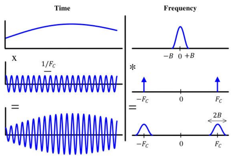 이 때 곱해진 정현파를 반송파(carrier)라고 부른다.