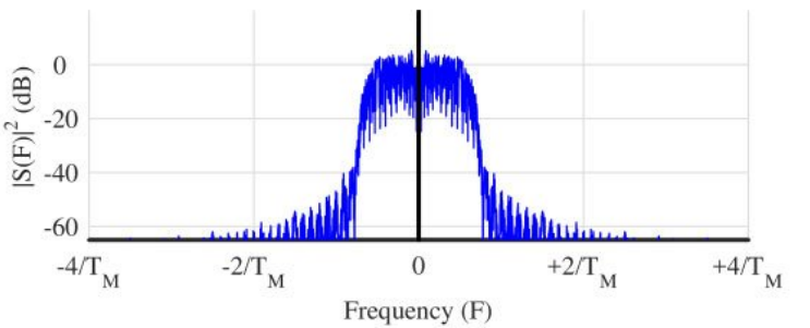 위 그림은 200개의 PAM 변조된 심볼을 SRRC Pulse Shaping 필터링한 신호의 스펙트럼 모양이다.