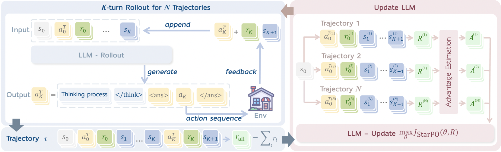 J_\text{StarPO}(\theta)=\mathbb{E}_{M,\tau\sim\pi_\theta}[R(\tau)] $$