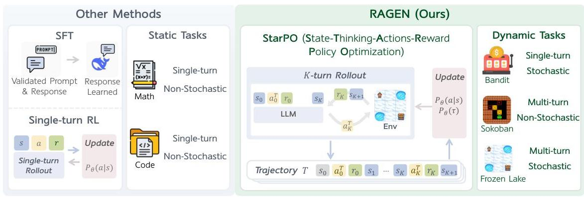 Multi-turn & Trajectory-level의 RL 프레임워크인 StarPO(State-Thinking-Actions-Reward policy optimization)를 제안