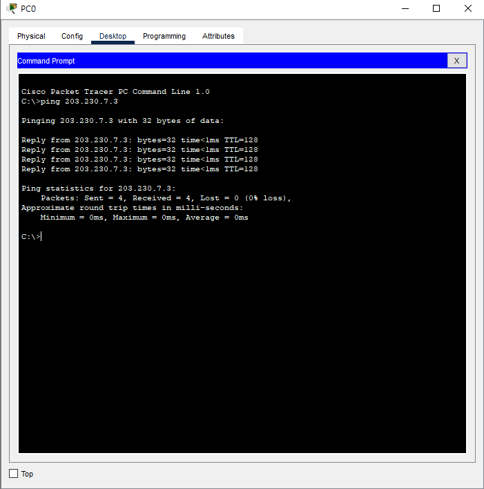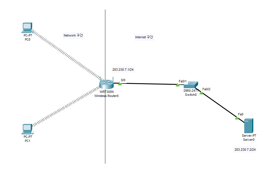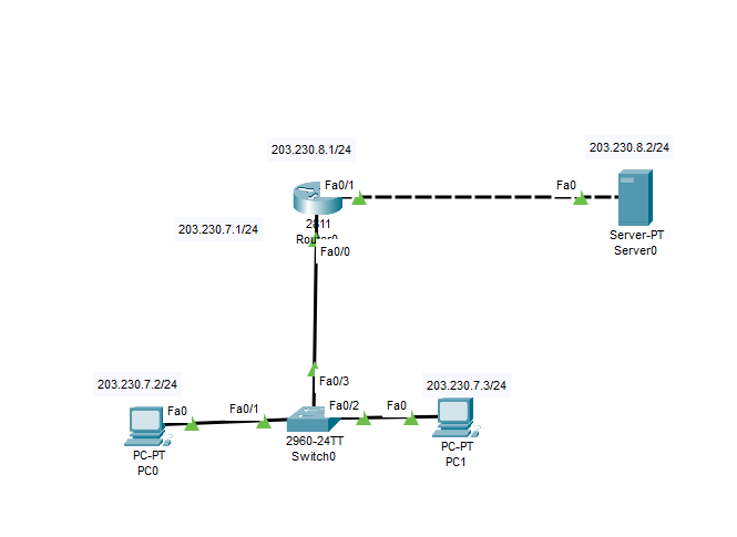 하지만 203.230.8.1 네트워크에 있는 Server0와 PC0간의 통신에는 게이트웨이가 필요한데