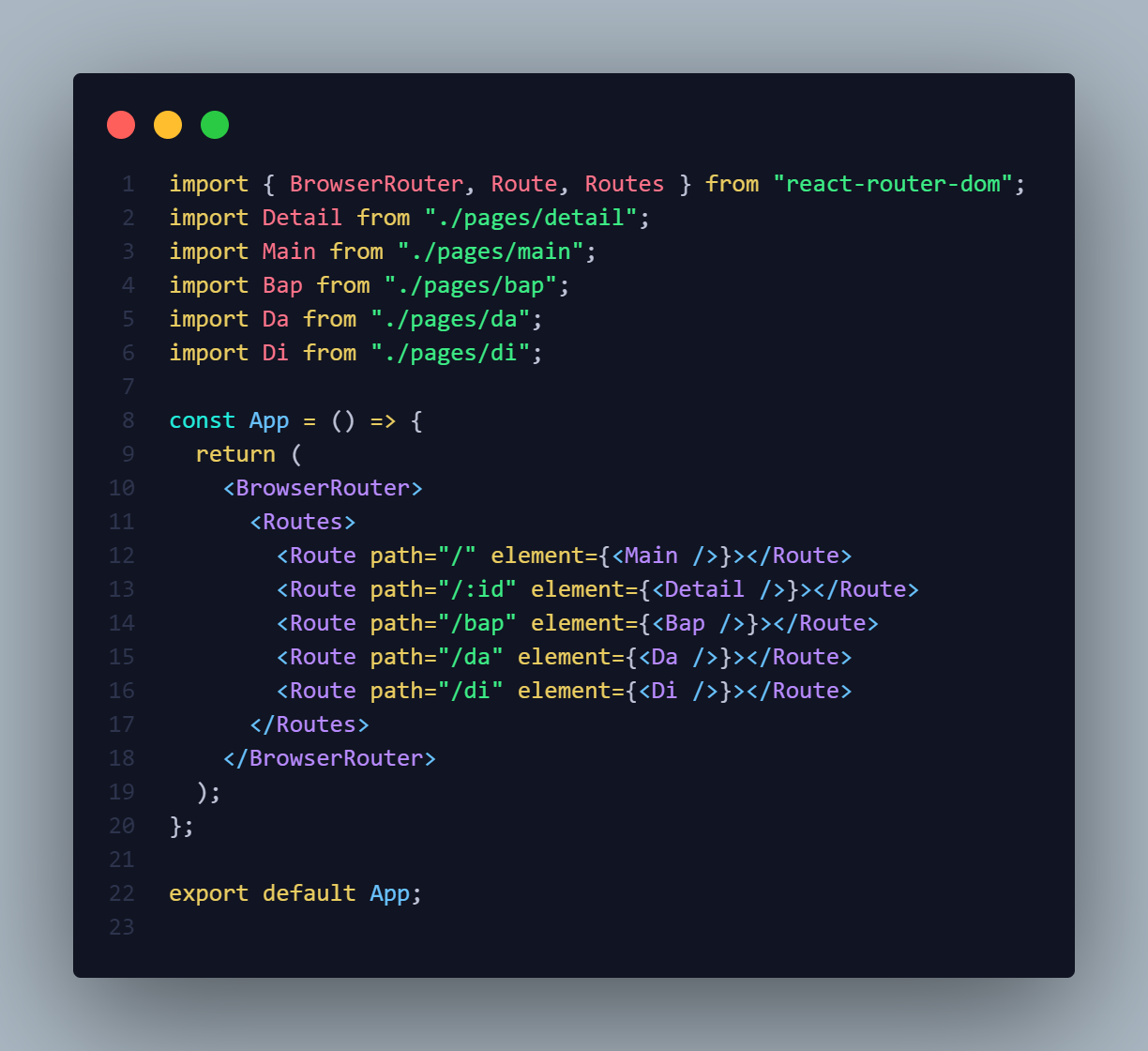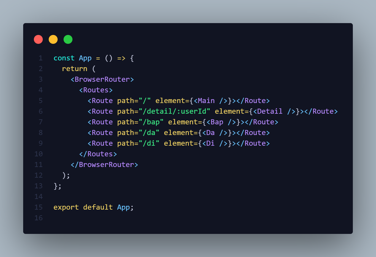 먼저 BrowserRouter 안에 Routes 그다음 안에 Route형식으로 넣어준다