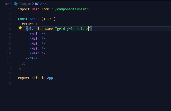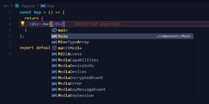 App.jsx로 다시가서 div 안에 Main 자동완성 뒤에 ./components/Main 확인하고