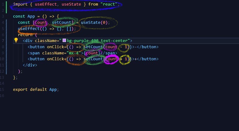 버튼 onClick 이벤트에서 setCount 함수에 초기값 0인 count를 각 -1과 +1을 넣어줬다
