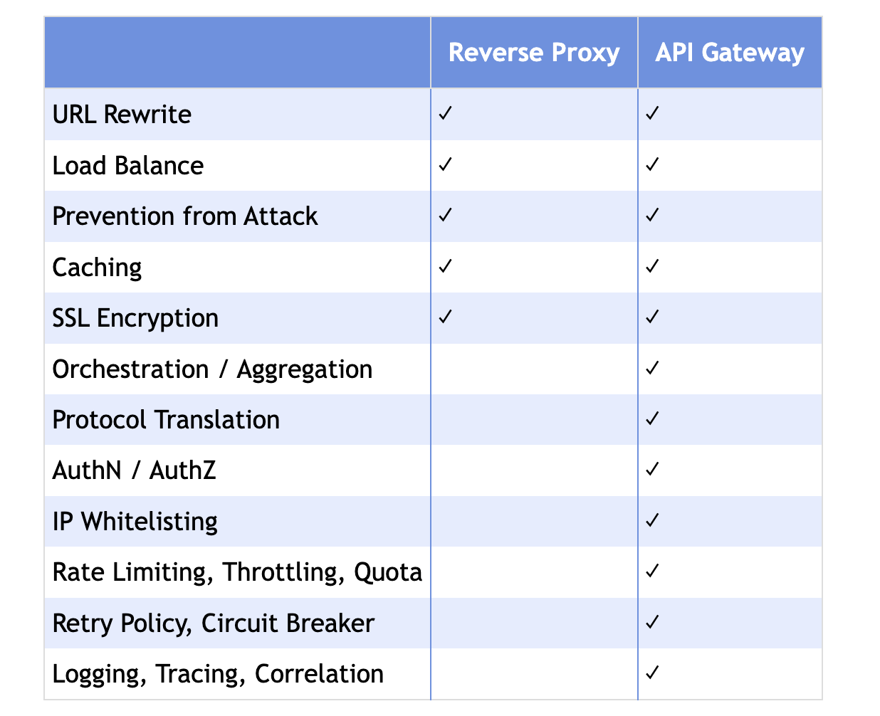 API Gateway is often considered as a superset of a reverse proxy implying that an API Gateway offers all the available features of a reverse proxy and offers more features. Below could be a good comparison between the two: