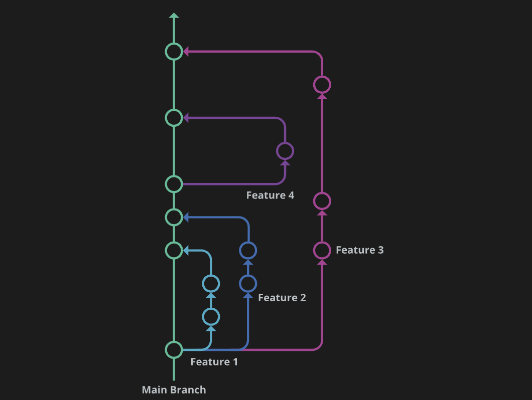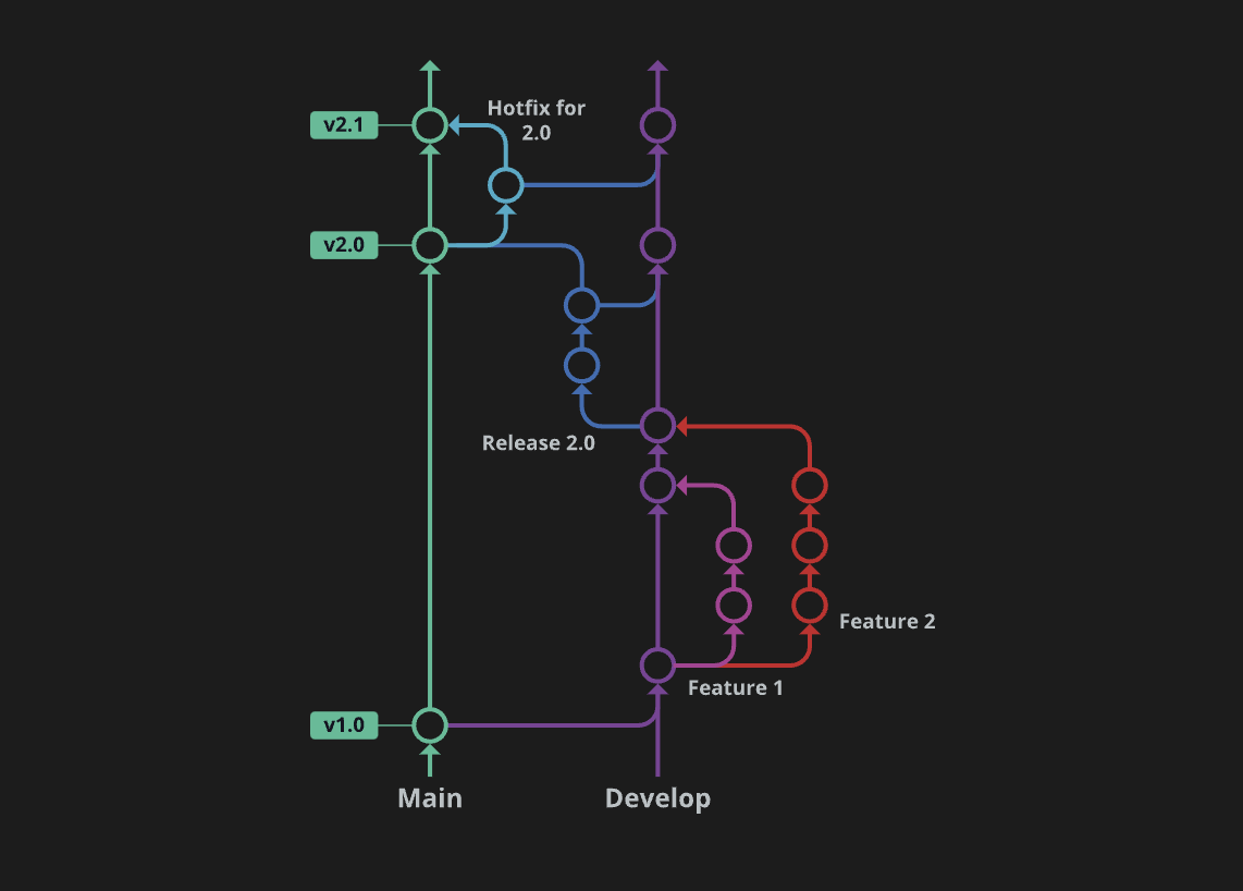 Git Flow aims to simplify the overall release process and further address issues that were unable to be addressed in the above GitHub Flow strategy.