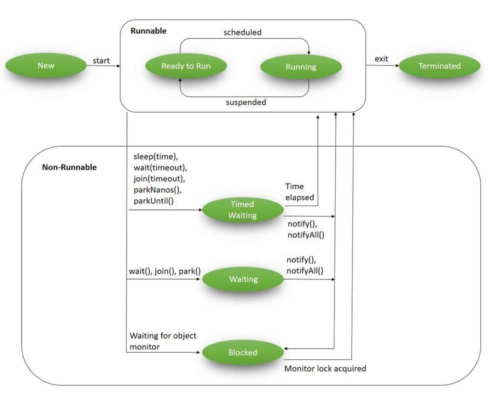 Timed WaitingA state that is invoked from the Thread.sleep() method. wait() and join() methods with the time parameters can also make threads fall in this state.