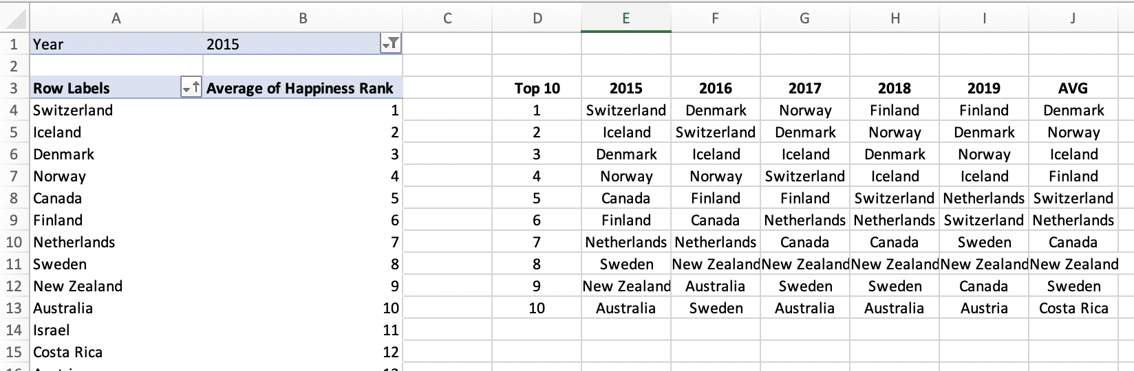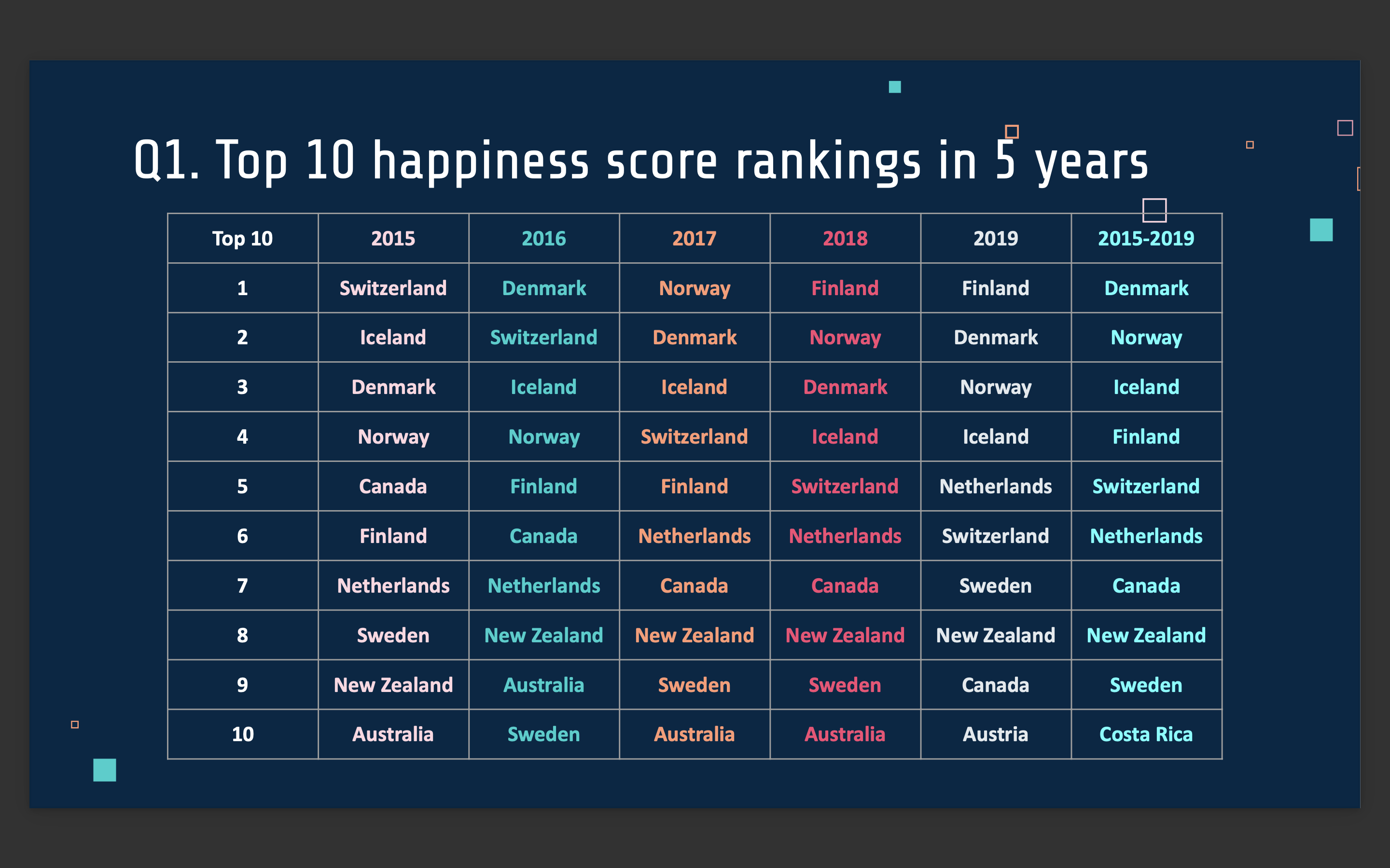 Q1. Top 10 highest happiness scores in 5 years