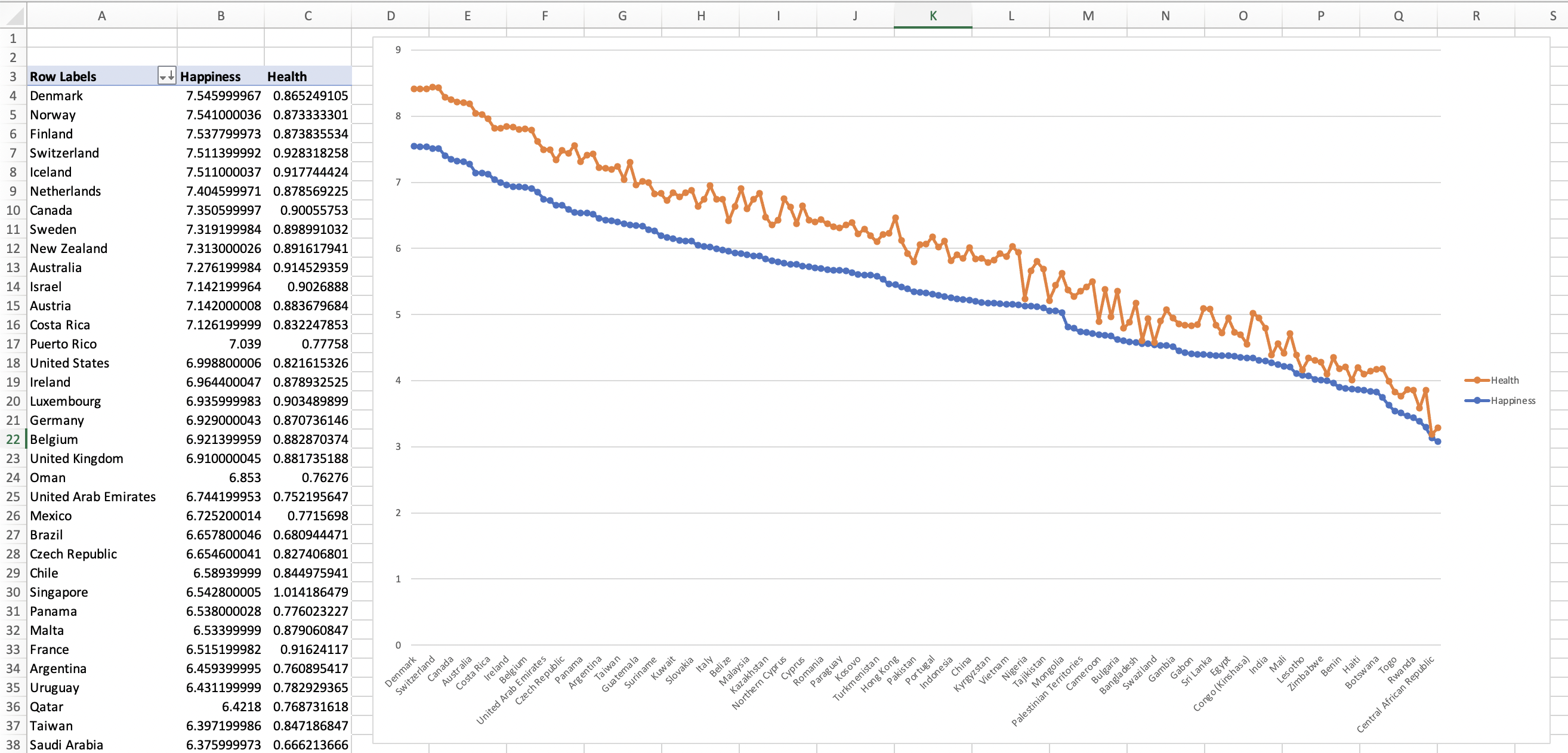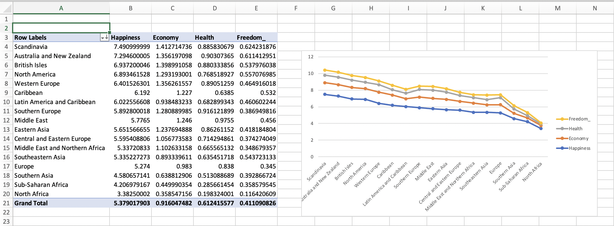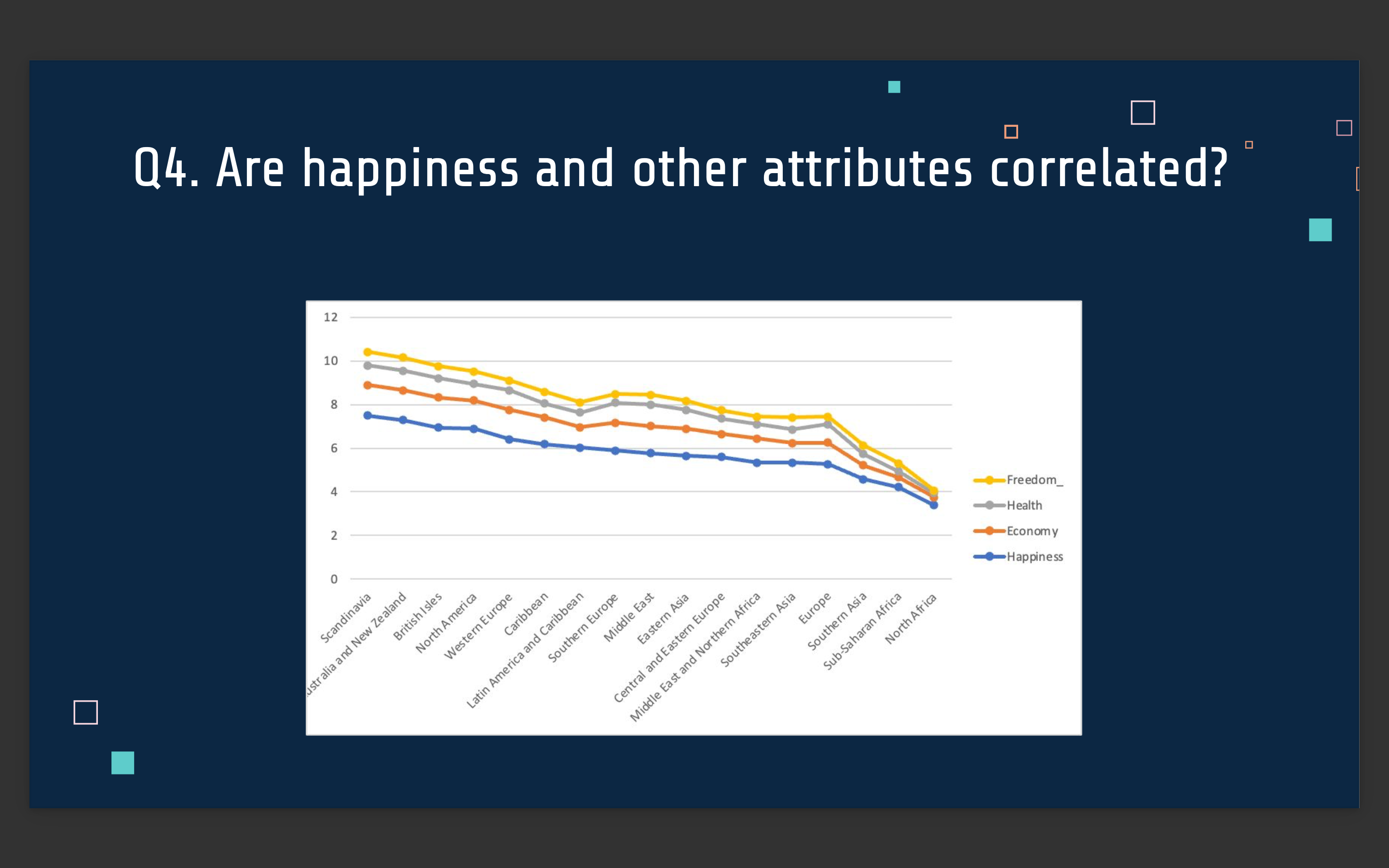 Q4. Are happiness and other attributes correlated among them by using a pivot chart?