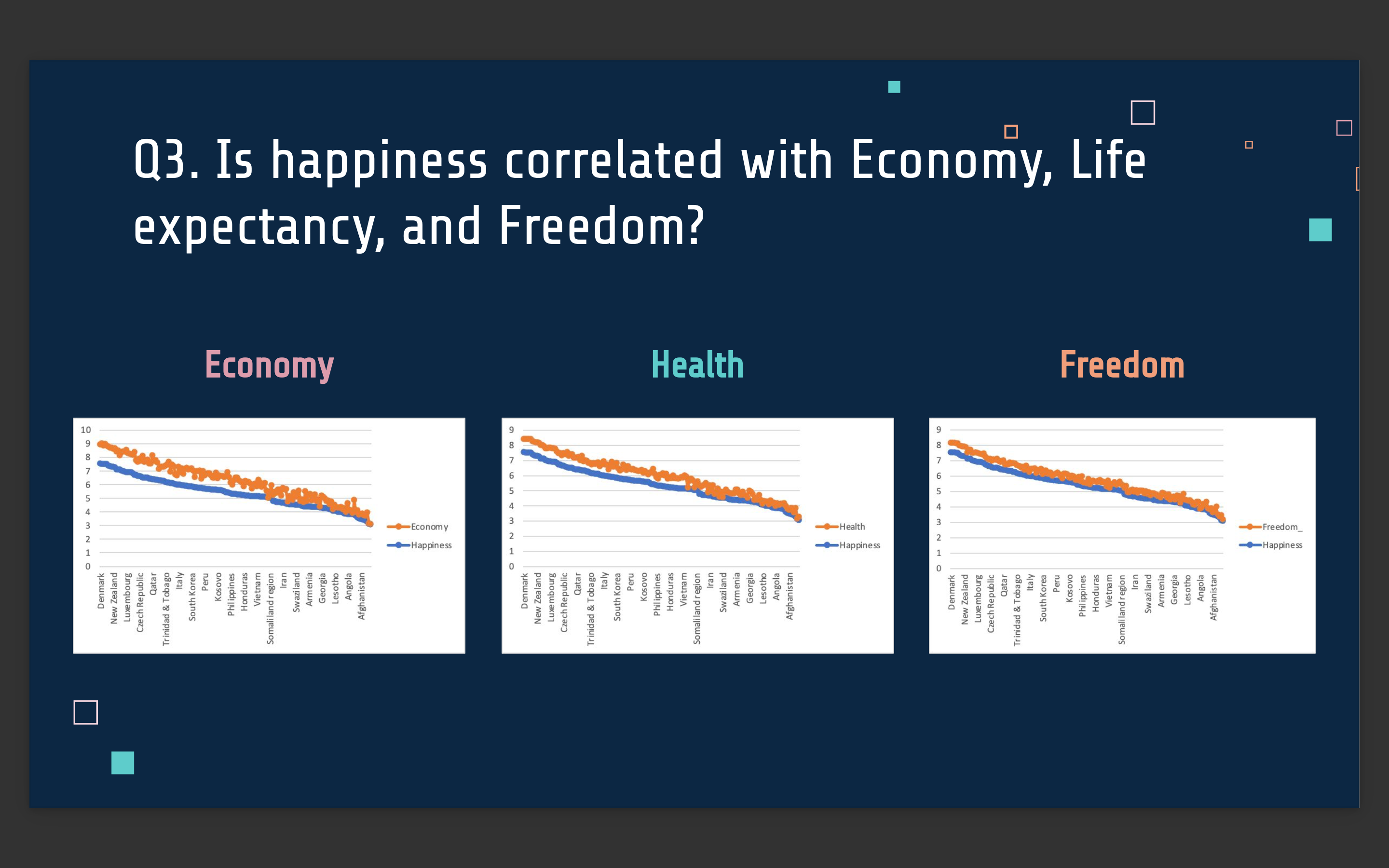 Q3. Is happiness correlated with each one of the attributes: GDP, Life expectancy, Freedom?