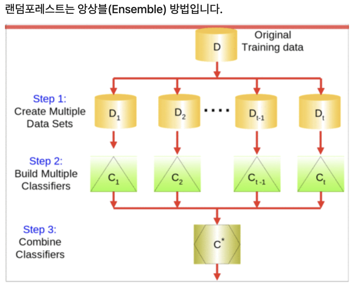 - 추출된 여러개의 샘플 세트을 가지고 각각의 '결정트리' 모델을 구현한다.