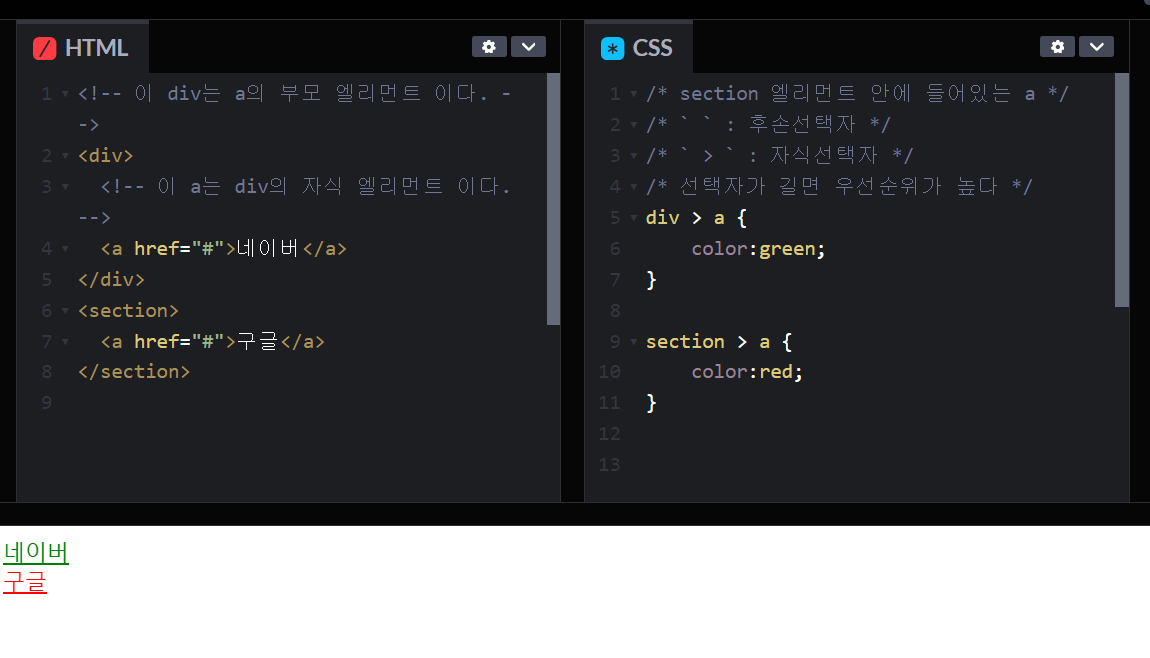 - 후손선택자보다 부모선택자가 우선순위가 더 옾다.