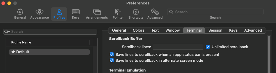Preferences > Prifiles > Terminal > Unlimited scrollback 체크