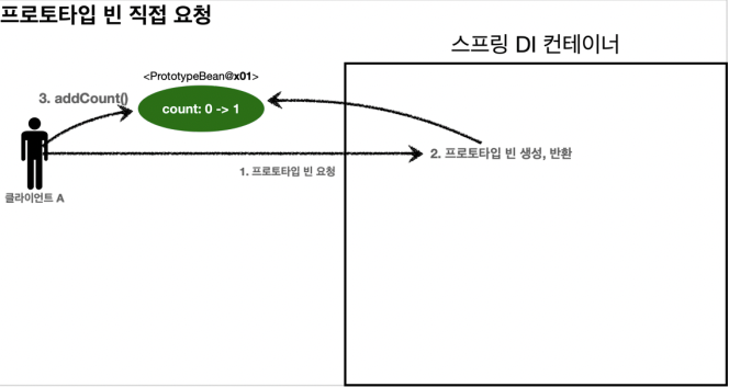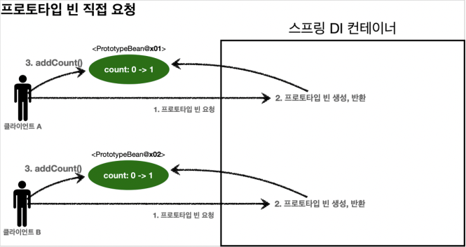 를 호출해서 프로토타입 빈의 count를 증가한다.clientBean