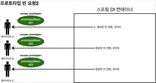 클라이언트에 빈을 반환하고 나면, 이후 스프링 컨테이너는 생성된 프로토타입 빈을 관리하지 않는다.