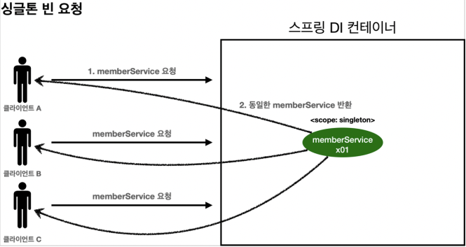 보통은 스프링 컨테이너가 시작과 함께 생성되어서 스프링 컨테이너가 종료될 때 까지 유지되는 싱글톤 스코프로 생성이 된다.