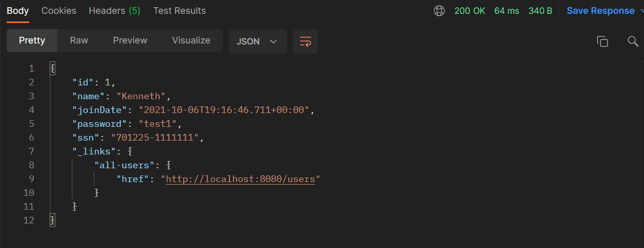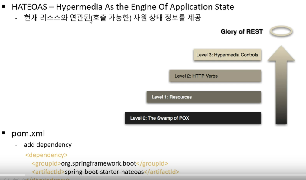 HATEOAS라는 현재 사용하고 있는 REST API의 자원 또는 호출 가능한 자원 상태를 보여준다.