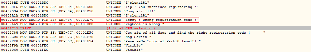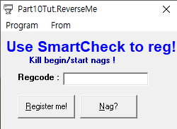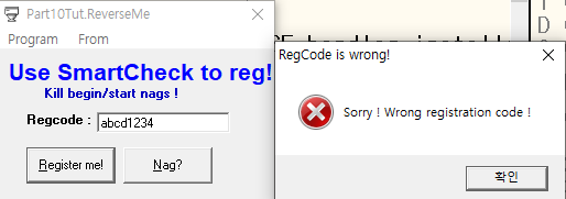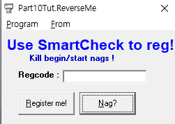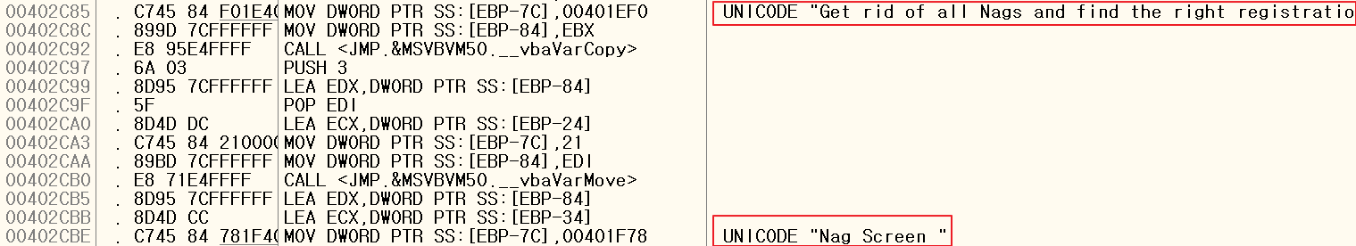 여기서 [Nag?] 버튼을 누르면 처음 브레이크 포인트로 잡았던 402CFE 주소의 MsgBox로 이동하는 것을 확인할 수 있었습니다