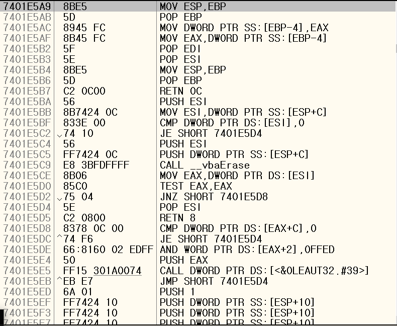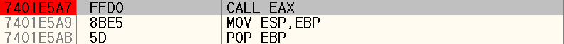 7401E5A7 에서 EAX를 CALL한 후 스택을 정리하는 어셈블리어 코드를 확인할 수 있습니다