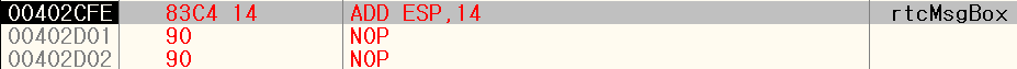 그러므로 Nag 메시지를 발생시키는 주소는 402CFE의 메시지 박스 API이며 해당 부분을 수정해주면 Nag 메시지는 수정이 가능할 것입니다