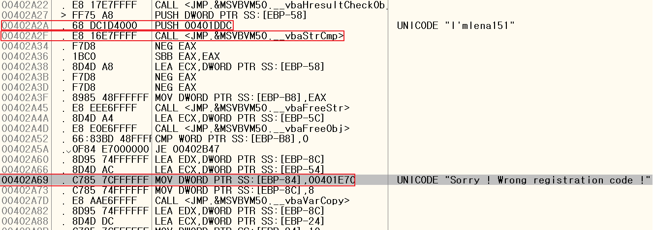위 쪽을 살펴보면 vbaStrCmp() 함수를 호출하고 있는 것을 볼 수 있습니다