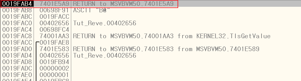 함수 시작 코드에서 스택에 저장된 리턴 주소인 7401E5A9를 확인했습니다