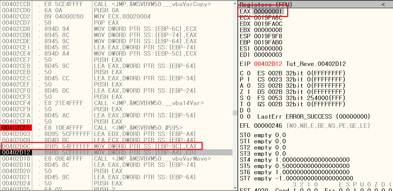 MsgBox()는 리턴 값으로 EAX를 이용합니다