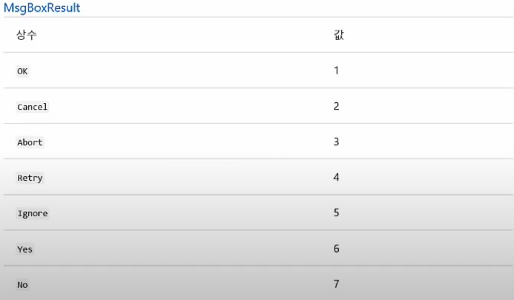 VB에서 메시지 박스를 이용하는 API는 MsgBox입니다