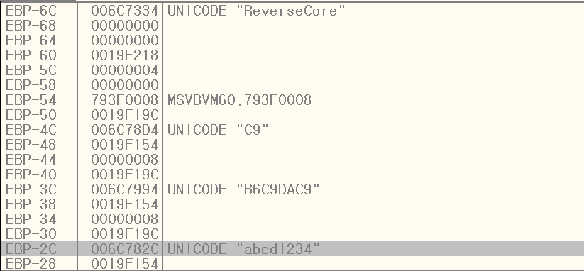 스택에서 EBP를 기준으로 정렬하면 우리가 입력한 값들을 확인할 수 있습니다