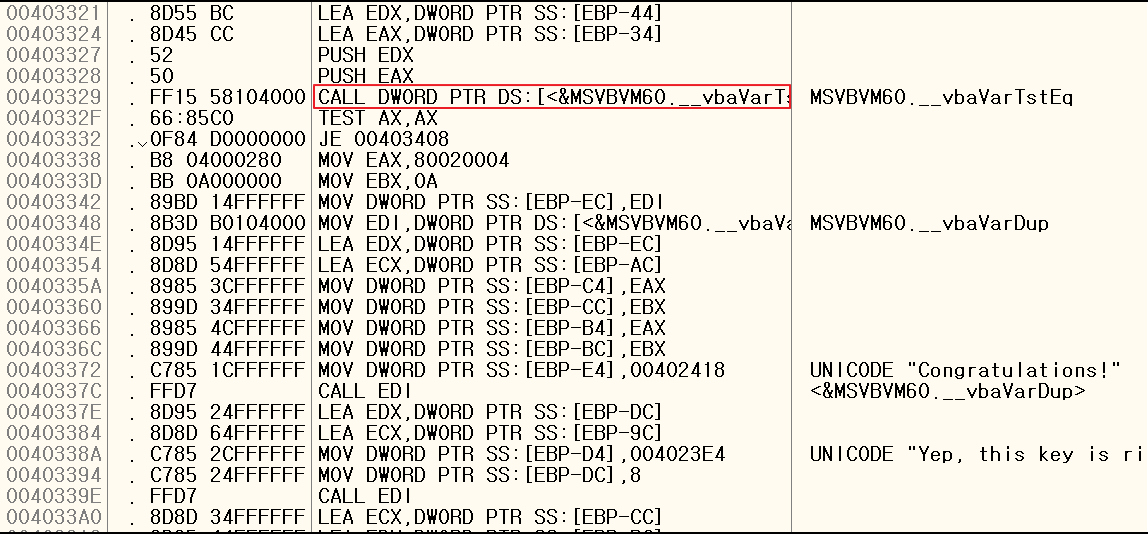 403329 주소의 _vbaVarTstEq() 함수를 호출 한 뒤 리턴 값(AX)을 비교(TEST 명령)한 후 403332 주소의 조건 분기(JE 명령)에 의해서 참, 거짓 코드로 분기하게 됩니다