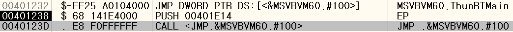 MSVBVM60.dll!ThunRTMain()으로 직접 가는 것이 아닌 중간의 401232 주소의 JMP 명령을 통해서 가는 방식입니다