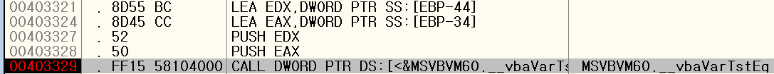 403329 주소의 _vbaVarTstEq() 함수가 문자열 비교 함수(예를들어 strcmp)라면 그 위에 있는 두개의 PUSH는 비교 함수의 파라미터, 즉 비교 문자열이 될 것입니다