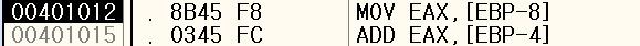 명령 실행 후 EAX에는 [EBP-8](변수 x의 값 =1)이 입력되며 ADD 명령어를 통해 EAX에 변수 y의 값 ([EBP-4] = 2)을 더해서 EAX에 저장합니다