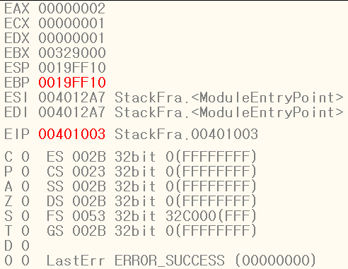 즉 add() 함수를 시작할 때의 ESP 값(19FF10)을 EBP에 넣어 두었다가 함수 종료 시 ESP를 원래대로 복원시키는 목적으로 사용합니다