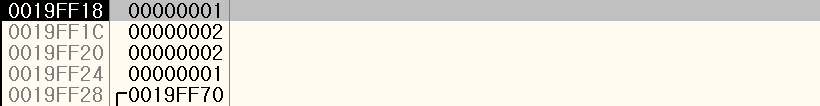 스택에서 19FF18과 19FF1C 주소의 내용은 add() 함수 사용 시 파라미터 a, b가 저장되어 있습니다