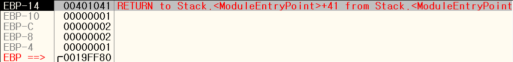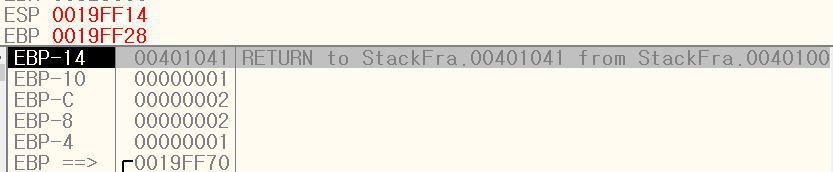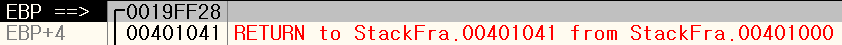 현재 ESP 값은 0019FF14이며 그 주소의 값은 401041입니다