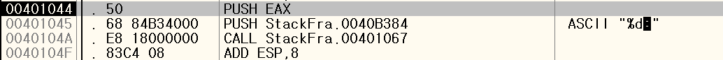 40104A 주소의CALL 401067 함수는 C 표준 라이브러리 printf() 함수 입니다
