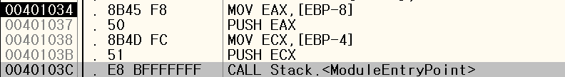40104F 주소에 ADD ESP, 8 명령으로 스택에서 함수 파라미터를 정리하고 있습니다