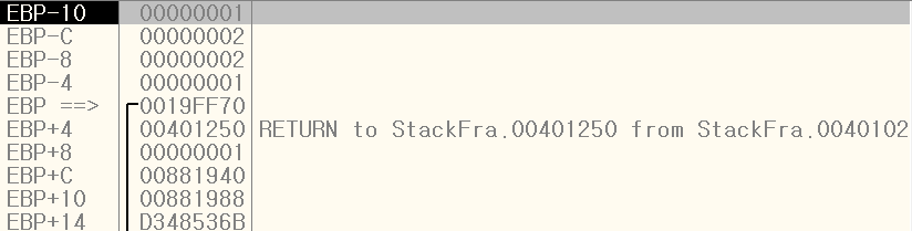 main()에서 사용되었던 EBP 값(19FF28)을 스택에 백업 후 EBP값은 새롭게 0019FF10으로 설정되었습니다