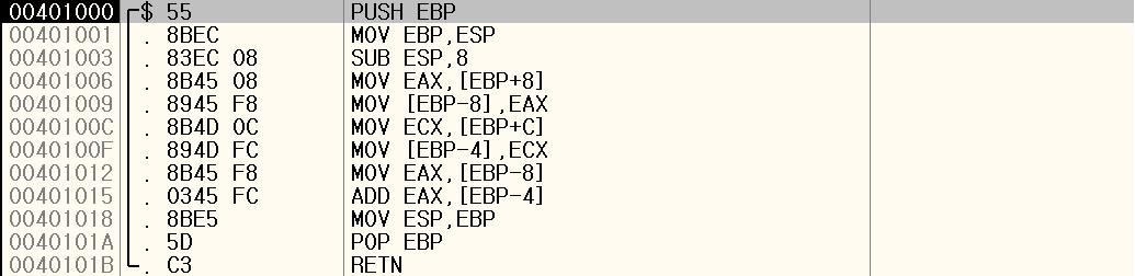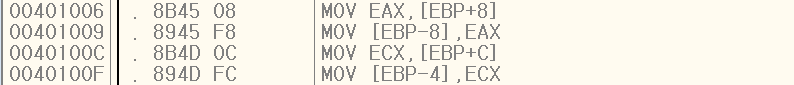따라서 [EBP+8]과 [EBP+C]는 각각 파라미터 a, b를 가리킵니다